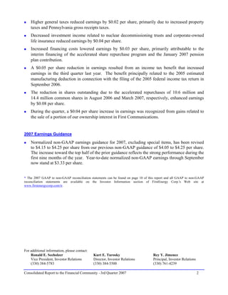 This document provides a consolidated report for FirstEnergy Corp.'s third quarter of 2007. Some key highlights include: - Normalized non-GAAP earnings were $1.32 per share for Q3 2007 compared to $1.42 per share for Q3 2006. - GAAP earnings were $1.36 per share for Q3 2007 compared to $1.41 per share for Q3 2006. - Earnings guidance for 2007 was revised to $4.15 to $4.25 per share from the previous range of $4.05 to $4.25 per share.