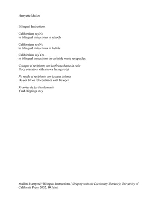 The poems cover a wide range of topics from bilingual instructions to relationships and mortality, with styles ranging from free verse to iambic pentameter. Several poems reflect on darkness, abandonment, and loss. A few poems also explore themes of art, nature, and humanity's connection to the past through objects like coal that fuel present warmth.