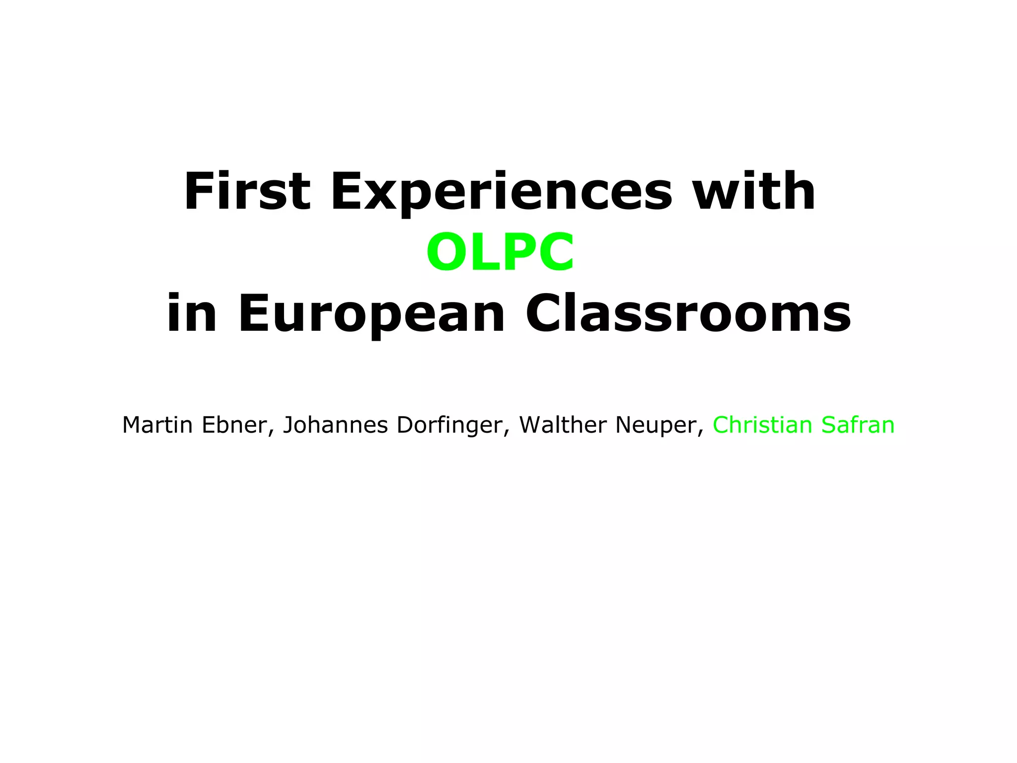 The document summarizes early experiences using OLPC laptops in European classrooms. It discusses the uLearning framework, issues around the digital divide and digital literacy. It describes the goals of developing typical educational software for the laptops that is adaptable to local curricula, teachers, and individual learners. Specifically, it discusses the "ReckonPrimer" math software and how it provides feedback on exercises and allows learners to escape pre-settings. It also notes design challenges experienced and plans for future implementation of the laptops and curricula in developing countries.