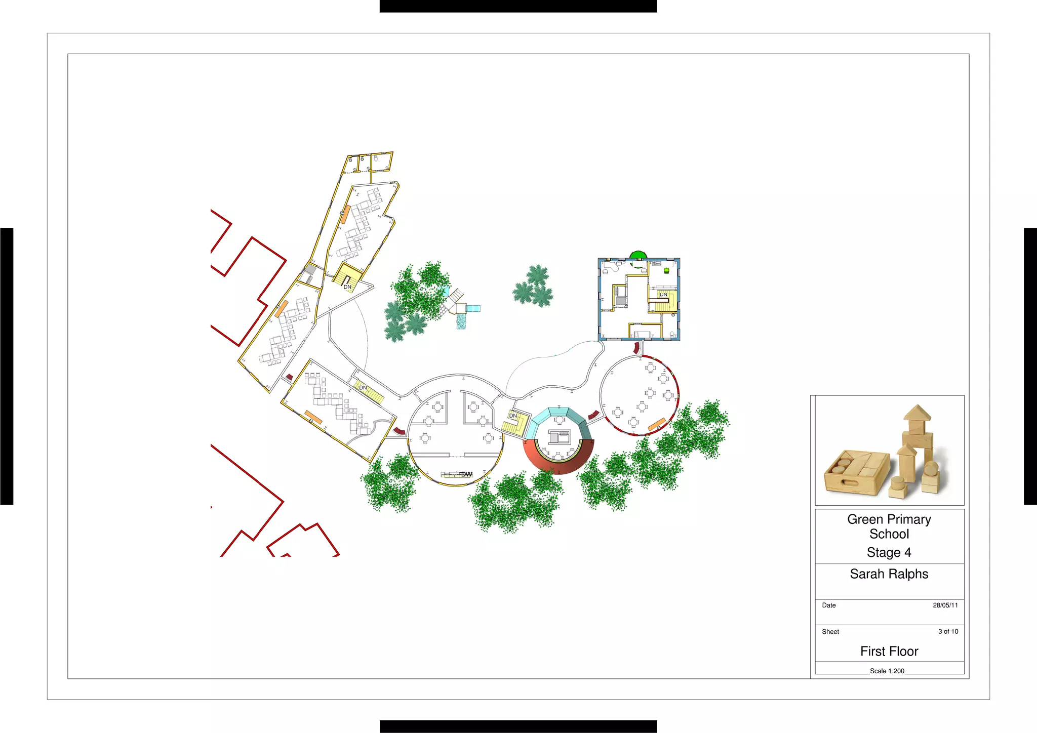 This document is an architectural drawing of the first floor of Green Primary School at a scale of 1:200. It was produced by Sarah Ralphs on May 28, 2011 and is sheet 3 of 10 for the school's stage 4 plans. The drawing was created using Autodesk student design software.