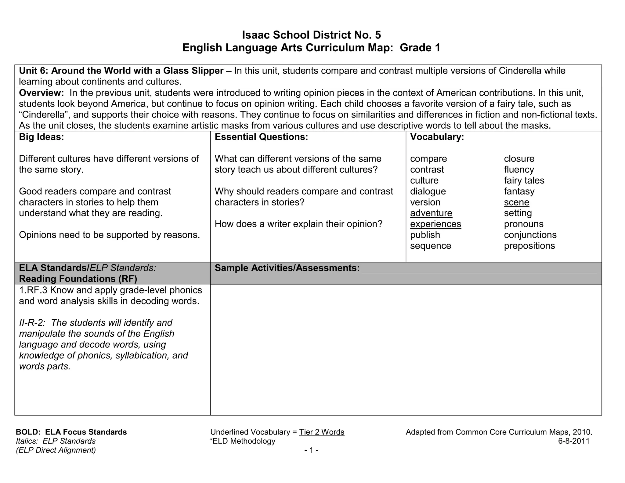 The document is an English Language Arts curriculum map for grade 1. It outlines a unit called "Around the World with a Glass Slipper" where students will compare and contrast multiple versions of Cinderella while learning about different cultures and continents. The unit focuses on opinion writing and comparing fiction and nonfiction texts. Key standards and activities are listed including comparing stories, summarizing texts, and writing opinion pieces. Vocabulary, routines, and assessments are also presented.
