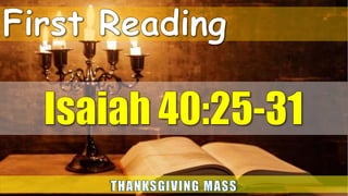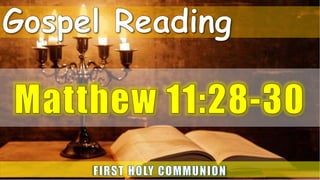 This document outlines the order of service for a First Holy Communion mass. It includes opening songs, prayers, readings from scripture, recognition of sins, sharing of peace, preparation of the gifts, consecration of the Eucharist, communion, and closing blessings. The mass focuses on welcoming children receiving Holy Communion for the first time and strengthening their faith through song, prayer, and receiving the body and blood of Christ.