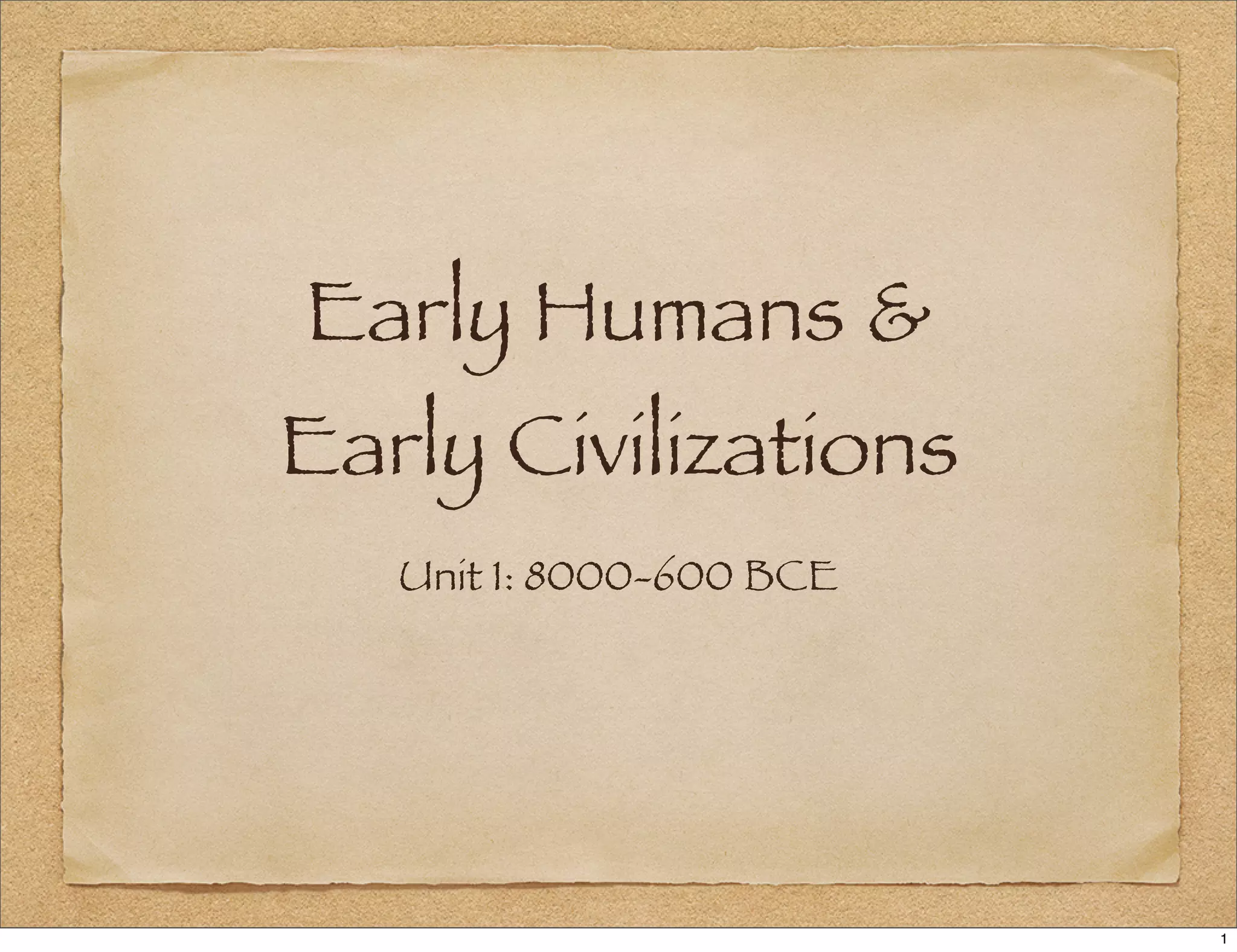 Early humans began migrating out of Africa starting around 1 million years ago. The earliest humans included Australopithecus, Homo habilis, Homo erectus, and Homo sapiens. Around 8,000 BCE, humans began transitioning from nomadic hunter-gatherer bands to more settled agricultural villages as part of the Neolithic Revolution. This led to improved living conditions, growing populations, and the development of early civilizations in Mesopotamia, Egypt, the Indus Valley, and others by around 6000 BCE.