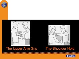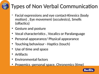 The document discusses various types of non-verbal communication, including facial expressions, body language, and gestures, breaking down elements such as eye contact, posture, touch, and personal space. It explains how body language conveys emotions and attitudes, highlighting the significance of first impressions. Additionally, it covers the etiquette and cultural nuances of handshakes, illustrating their potential meanings and importance in social interactions.