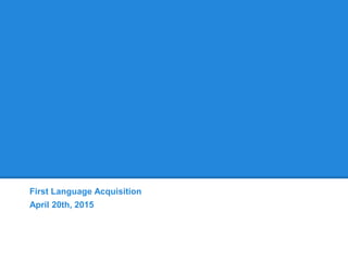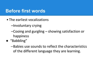 (1) Early vocalizations and babbling reflect the sounds of the language being learned. (2) Around 12 months, children say their first words. (3) By age 2, children start combining words into simple sentences of 2 words. (4) By age 4, children are able to use complex language structures like questions and commands most of the time. Theories on how children acquire their first language include behaviorism through imitation and reinforcement, as well as nativism which posits an innate language acquisition device.