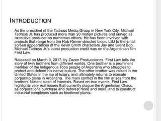 First Law is a film produced by Michael Tadross Jr. that tells the story of twin brothers from contrasting backgrounds—one an Indigenous Toba member in Argentina and the other raised in luxury in the U.S. The film explores their conflict as the corporate brother returns to exploit resources in Argentina, highlighting real issues such as deforestation and corporate greed. Released on March 9, 2017, it is based on true events affecting the Argentinian Chaco region.