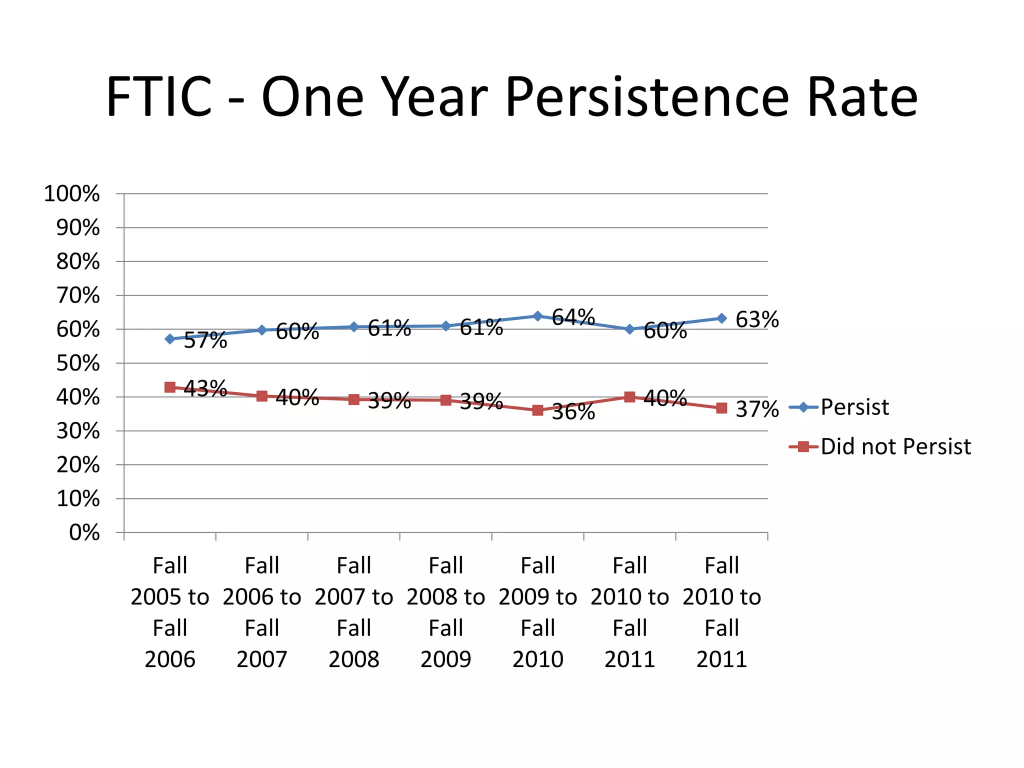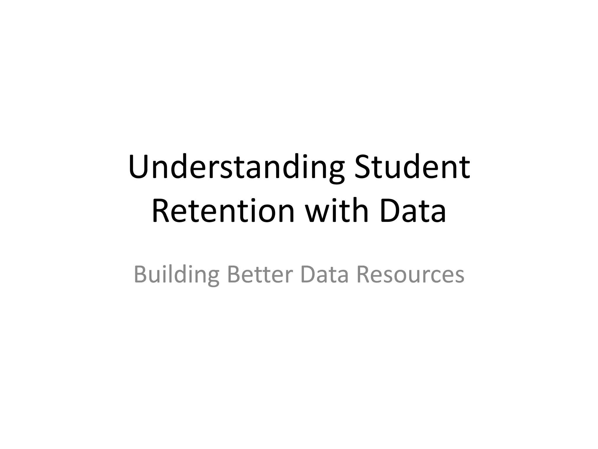 This document summarizes retention data from Texas A&M University-Corpus Christi. It shows first-time in college retention rates have increased from 57% to 64% from 2005 to 2010. It then analyzes retention based on factors like gender (female retention is higher), admission type (normal admits retain at a higher rate), academic standing (students in good standing retain more), and high school quartile (top quarter retains most). Subsequent slides provide more detailed breakdowns of retention by characteristics of student cohorts from 2011 and 2012, identifying risk factors. The goal is to build better data resources to understand student retention.