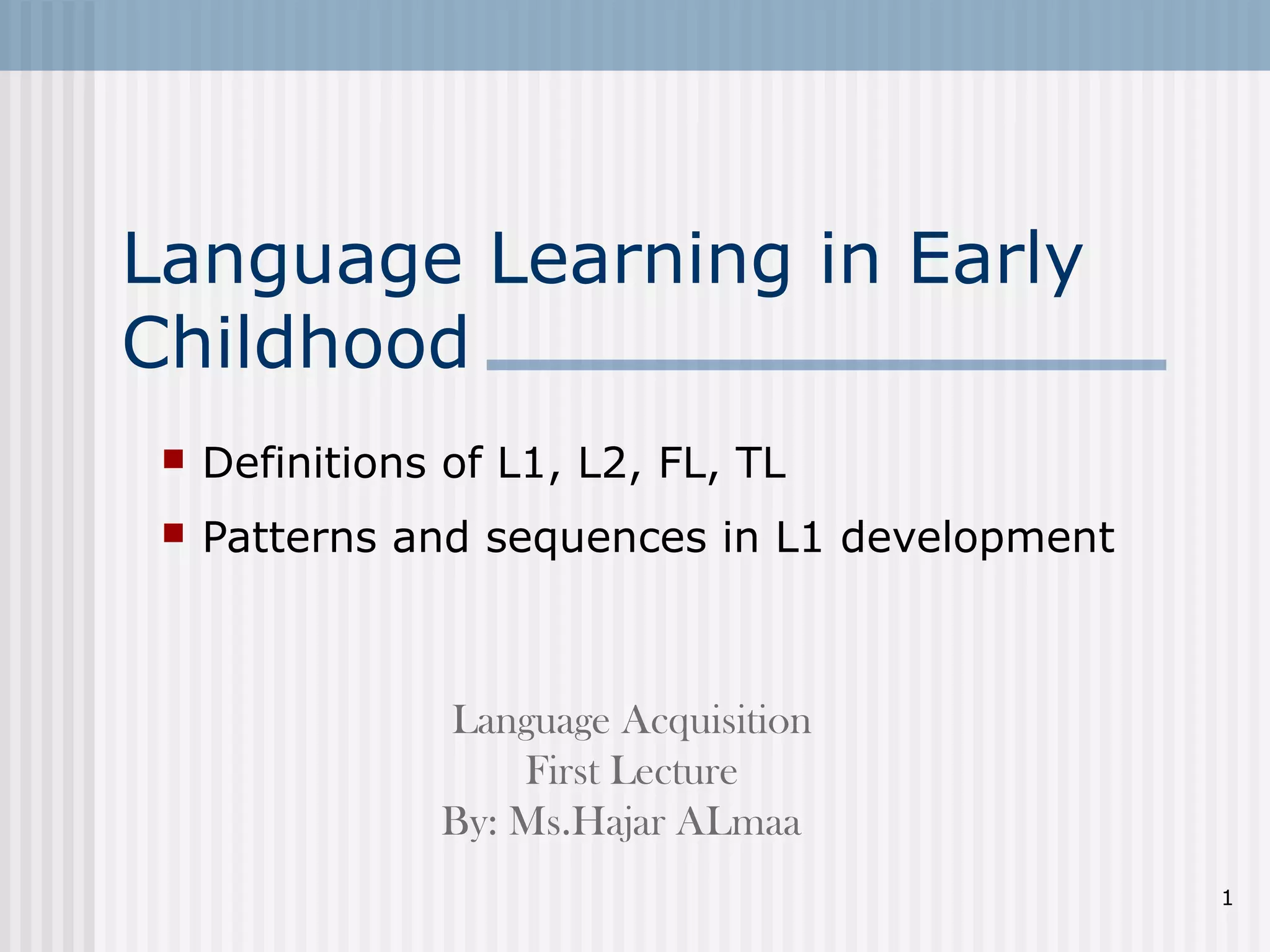 This document discusses language learning in early childhood. It defines key terms like first language (L1), second language (L2), foreign language (FL), and target language (TL). It then outlines typical stages and patterns in first language development from babbling to using multi-word sentences. These stages include single words, two word sentences, and gaining a vocabulary of over 10,000 words by age five. The document also compares language acquisition versus learning.