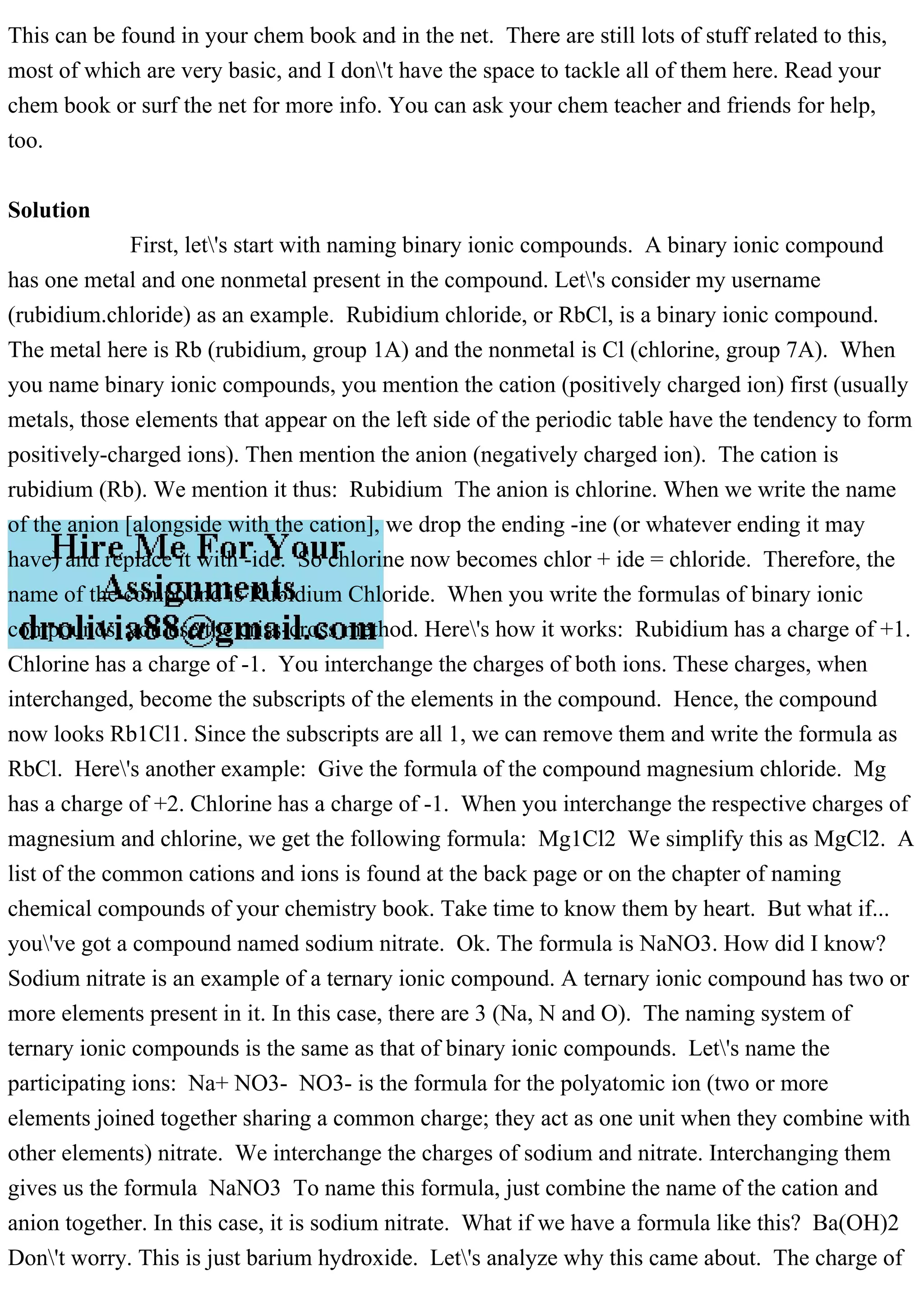 The document explains how to name and write formulas for binary and ternary ionic compounds, emphasizing the importance of cations and anions. It describes the criss-cross method for determining formulas, the conversion of anion names by changing their endings, and includes examples like rubidium chloride and sodium nitrate. Additionally, it mentions polyatomic ions and encourages further study of common cations and anions.
