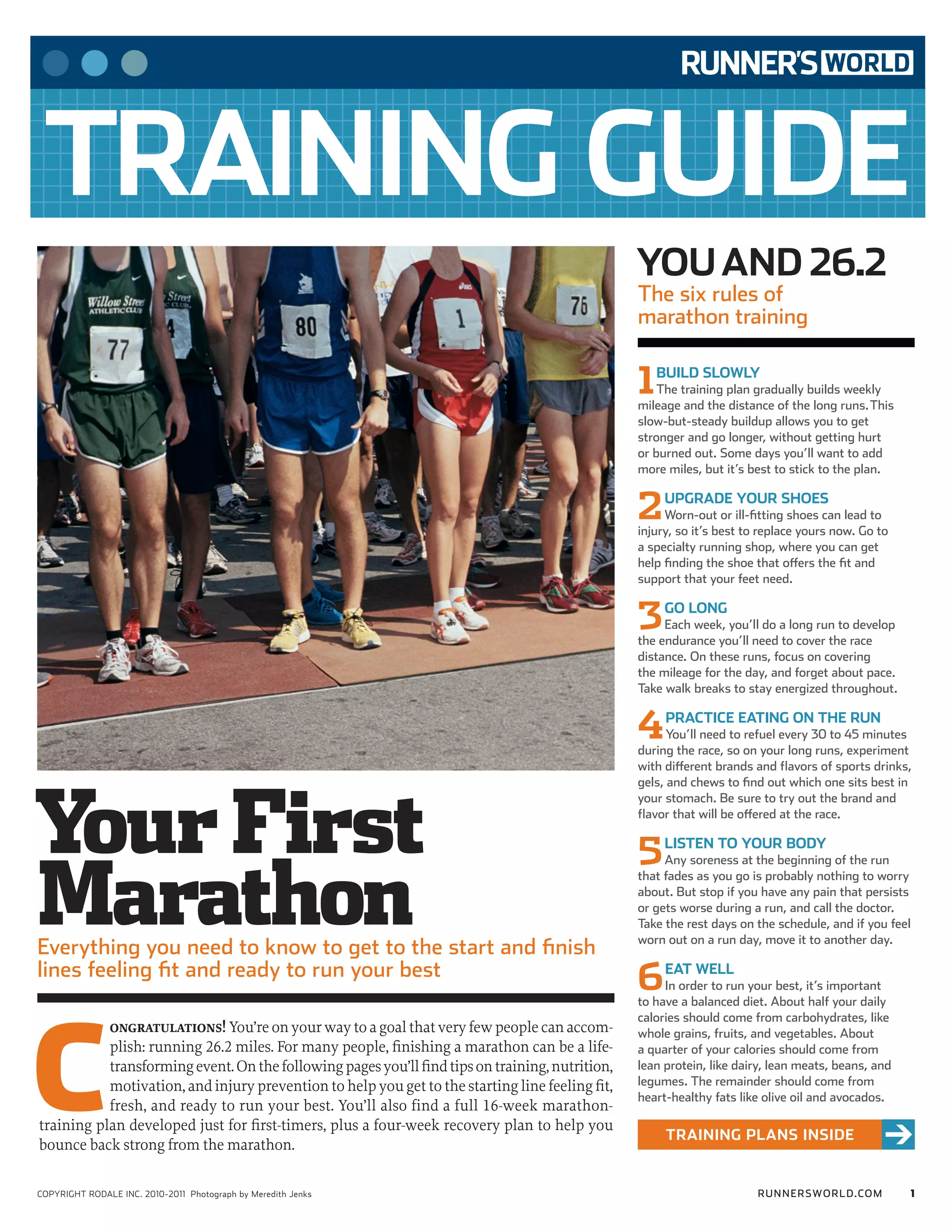 - A 16-week training plan for first time marathoners that gradually increases weekly mileage and includes one long run per week to build endurance.