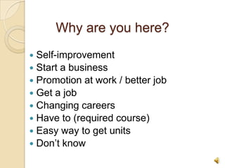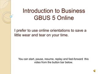 This document provides an orientation for students taking an online Introduction to Business course. It outlines why students may be taking an online course, the benefits and challenges of online coursework, what the instructor's roles both are and are not, how to communicate with the instructor, expectations around written assignments, textbook information, and the orientation assignment which involves reviewing online navigation instructions and submitting a student biography.