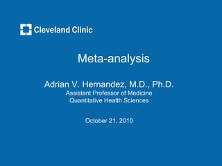 This document outlines a meta-analysis presentation by Dr. Adrian V. Hernandez, covering the definition, objectives, types, and methodology of meta-analysis, including the importance of study selection and biases. It discusses critical issues such as heterogeneity, publication bias, and the generation of hypotheses, along with reporting guidelines like PRISMA and MOOSE. The presentation emphasizes the value of meta-analyses in synthesizing research findings, enhancing precision, and supporting regulatory processes.