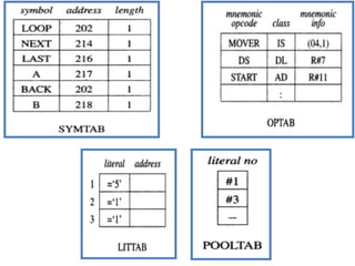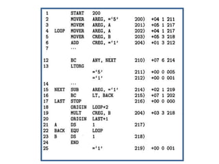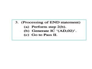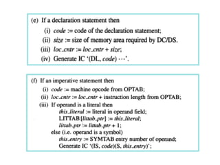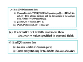 This document discusses the first pass of an assembler. It begins by defining an assembler as a language processor that converts assembly language to machine language. It then describes the different types of assemblers, focusing on single-pass and two-pass assemblers. For two-pass assemblers, it outlines the tasks of the analysis and synthesis phases in the first and second passes respectively. These include separating symbols, building symbol tables, performing label and literal processing, and constructing intermediate code in the first pass and then generating the target program in the second pass. The document provides an example of intermediate code format and walks through converting an example assembly program to intermediate code using the first pass of a two-pass assembler.
