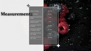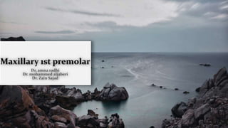 This document provides measurements and anatomical details for drawing a maxillary first premolar tooth. It includes the crown length, root length, diameters at different levels, curvature of the cervical line, and descriptions of features on the buccal, lingual, mesial, distal, and occlusal aspects to aid in rendering the tooth shape and morphology. Step-by-step instructions describe how to use the measurements to draw the tooth, placing landmarks and indicating contours, ridges, and other anatomical structures.