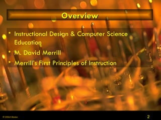 The document discusses applying Merrill's First Principles of Instruction to computer science education. It summarizes the five principles as: 1) using real-world problems to engage learners; 2) activating prior knowledge to build new knowledge; 3) demonstrating concepts rather than just explaining them; 4) allowing learners to apply their new knowledge through practice; and 5) integrating new knowledge into learners' lives. It argues CS courses could benefit from more deliberately designing instruction around these principles to better engage students and sustain their learning.