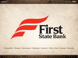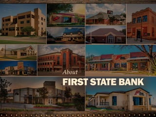 First State Bank is the oldest state-chartered bank in Texas, chartered in 1905. It has a personal approach to banking and strives to hire employees who care about people and the community. The bank has 12 locations across 4 contiguous counties in North Texas and its mission is to treat the community, customers, and employees like family.