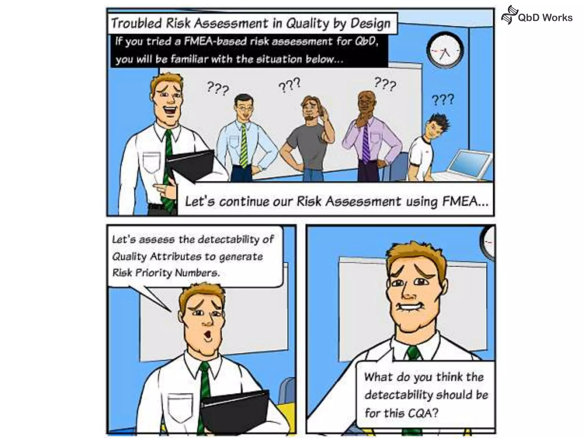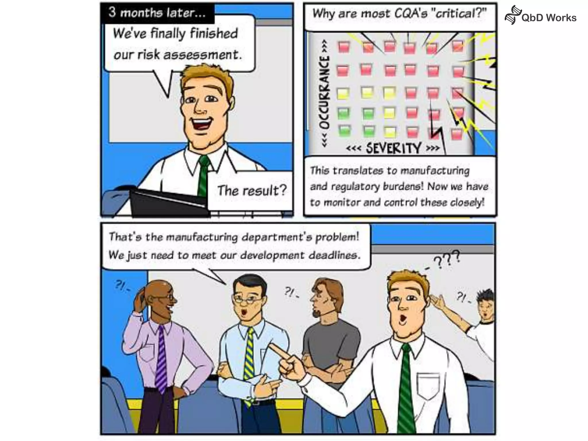 The document discusses best practices for risk assessment, which is the first step in Quality by Design (QbD). It recommends that risk assessment should focus on linking process parameters (CPP) to critical quality attributes (CQA) and how they ultimately impact the quality target product profile (QTPP). Failure Mode and Effects Analysis (FMEA) is not always the ideal tool for early development projects due to a lack of process understanding. Instead, it suggests using a simpler rating system of impact vs probability of occurrence to prioritize risks. Building these linkages from QTPP to CQA to CPP is key to developing a successful control strategy and executing QbD projects.
