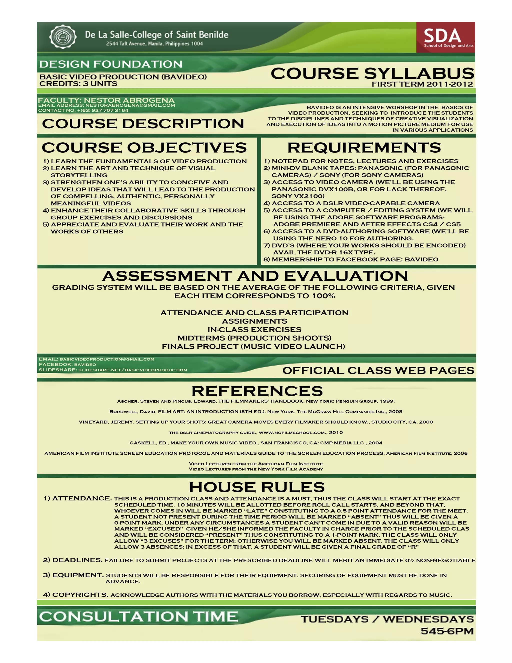The course outline summarizes a 14-week video production course. It covers topics like camera operation, lighting, editing, and production of a final music video project. Students learn film language, shoot exercises applying concepts, and work in groups to produce a music video over the course of the semester. The course culminates in the submission and screening of students' music videos in the finals week.