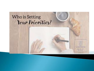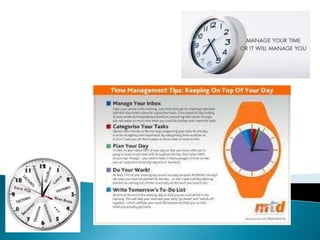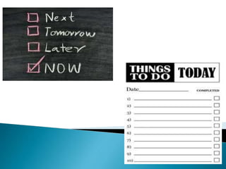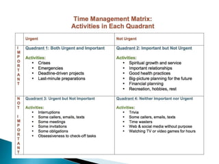The document discusses effective time management and prioritizing important tasks. It suggests that focusing on quadrant 2 activities like reading, training, exercising, relationship building, planning, upgrading and preventive measures could make a tremendous positive difference in one's personal and professional life. Other tips mentioned are keeping the main thing the main thing, doing important tasks first, avoiding procrastination, and doing good things now and bad things later. Overall, the document emphasizes the importance of using time wisely and focusing on high-value activities.