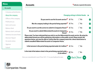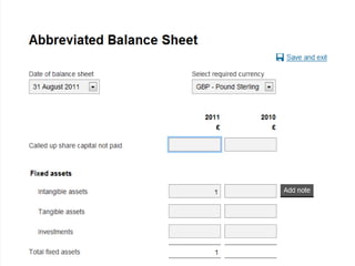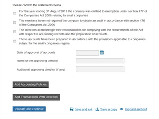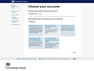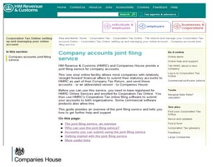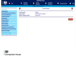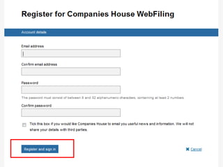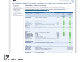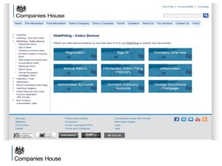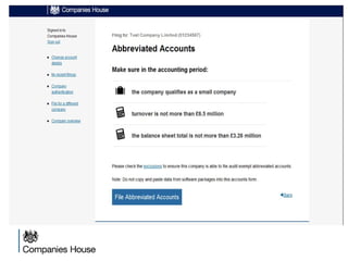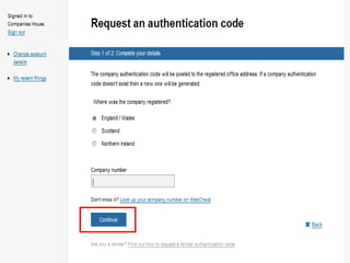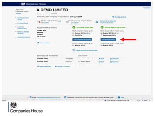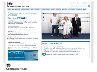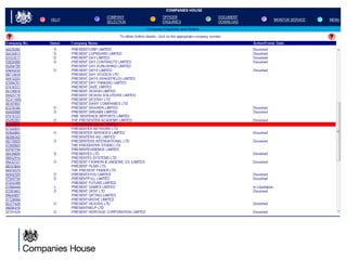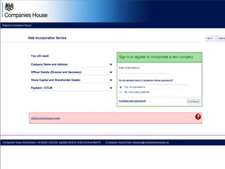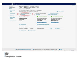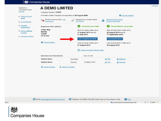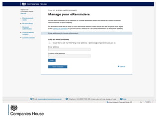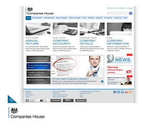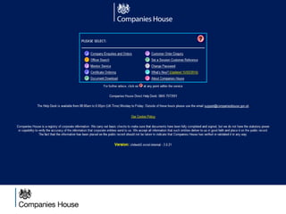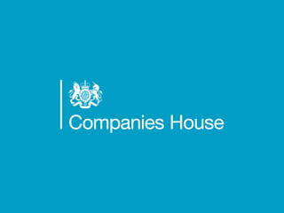 The document provides an agenda for a Companies House presentation covering various topics related to limited companies, filing information, and intellectual property. The agenda includes welcome and introductions, an overview of Companies House and the Companies Act 2006, a break, how to file information online, information services, intellectual property, and conclusions. Key details are provided about Companies House's role recording UK company life events, strategic goals to provide free data and electronic filing, and the various types of companies. Processes like incorporation, making changes, annual returns, and accounts are outlined. Responsibilities of directors, secretaries, and penalties for late filings are covered. The presentation will conclude with a discussion of intellectual property.