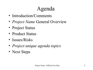 This document provides an overview and status update for a first time IT project. It summarizes the project name, organization, objectives, schedule, deliverables, costs, risks, and next steps. The project is currently in the programming stage and facing some issues around funding and resource availability. The next steps are to complete integration and testing and begin the installation and acceptance stage.