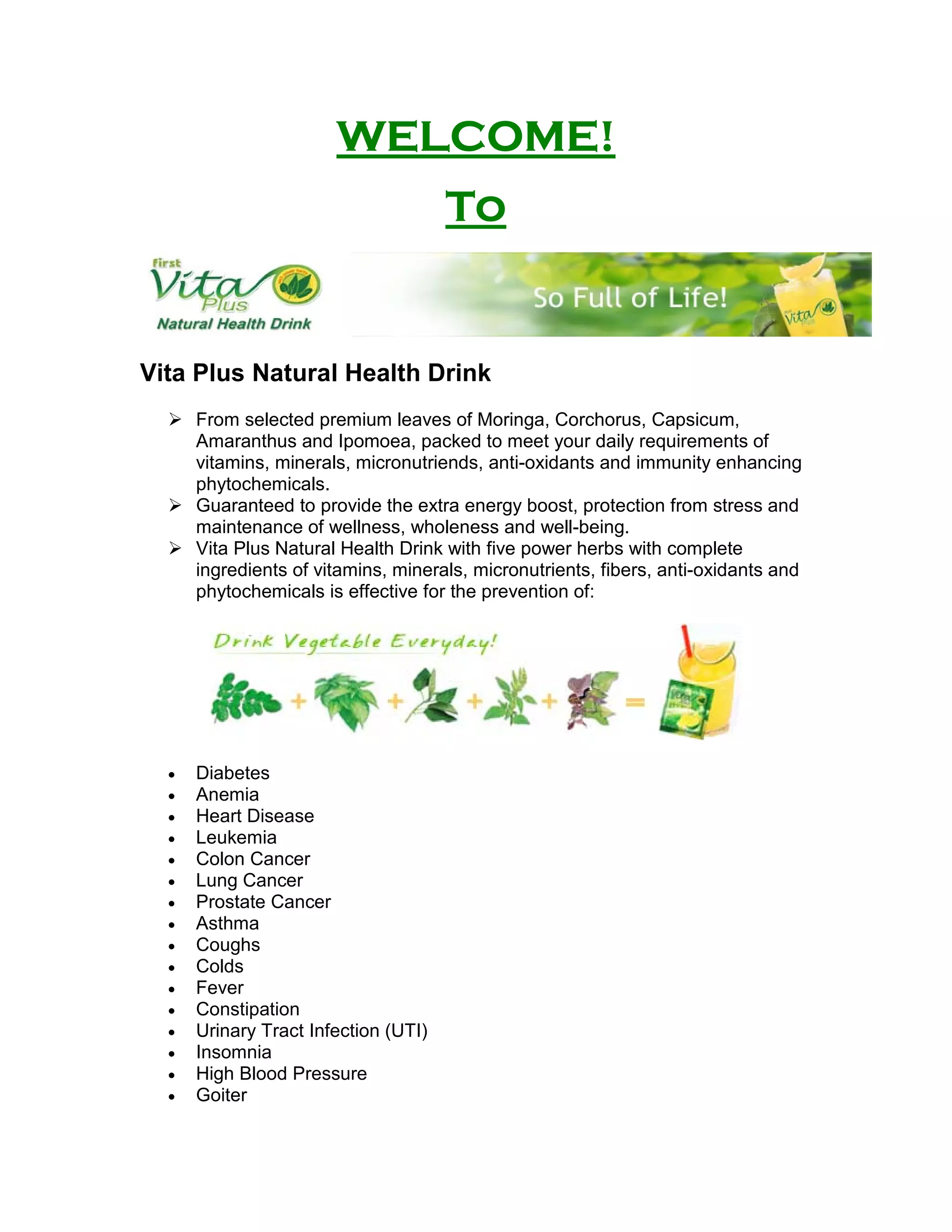 Vita Plus is a natural health drink made from five premium herbs that provides essential vitamins, minerals, and phytochemicals to boost energy, immunity, and overall wellness. It is designed to prevent various health issues including diabetes, heart disease, and respiratory conditions, while also promoting lactation and digestion. The drink is suitable for all ages and can serve as a substitute for daily vitamins and fruits.