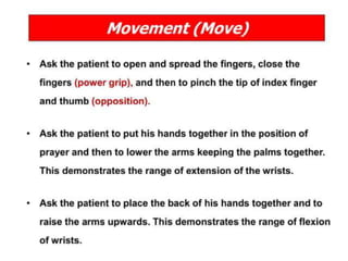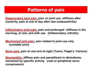 – burning sharp, stabbing, crushing; also explain depth of pain – superficial or deep.