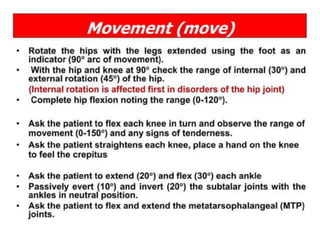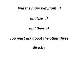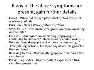 -> Onset, course, duration, aggravating factors, relieving factors.