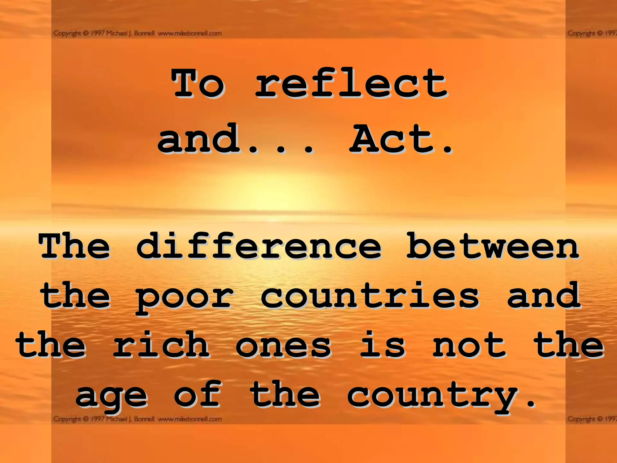 The document summarizes that the difference between poor and rich countries is not due to factors like age, natural resources, or intellectual ability, but rather the attitudes and principles followed by their people. It lists principles like ethics, integrity, responsibility, respect for laws and others' rights, work ethic, savings, and punctuality that are commonly followed in rich countries and help drive their success, but are less commonly followed in poor countries. It argues that countries can develop and overcome poverty by cultivating these principles through education and culture.