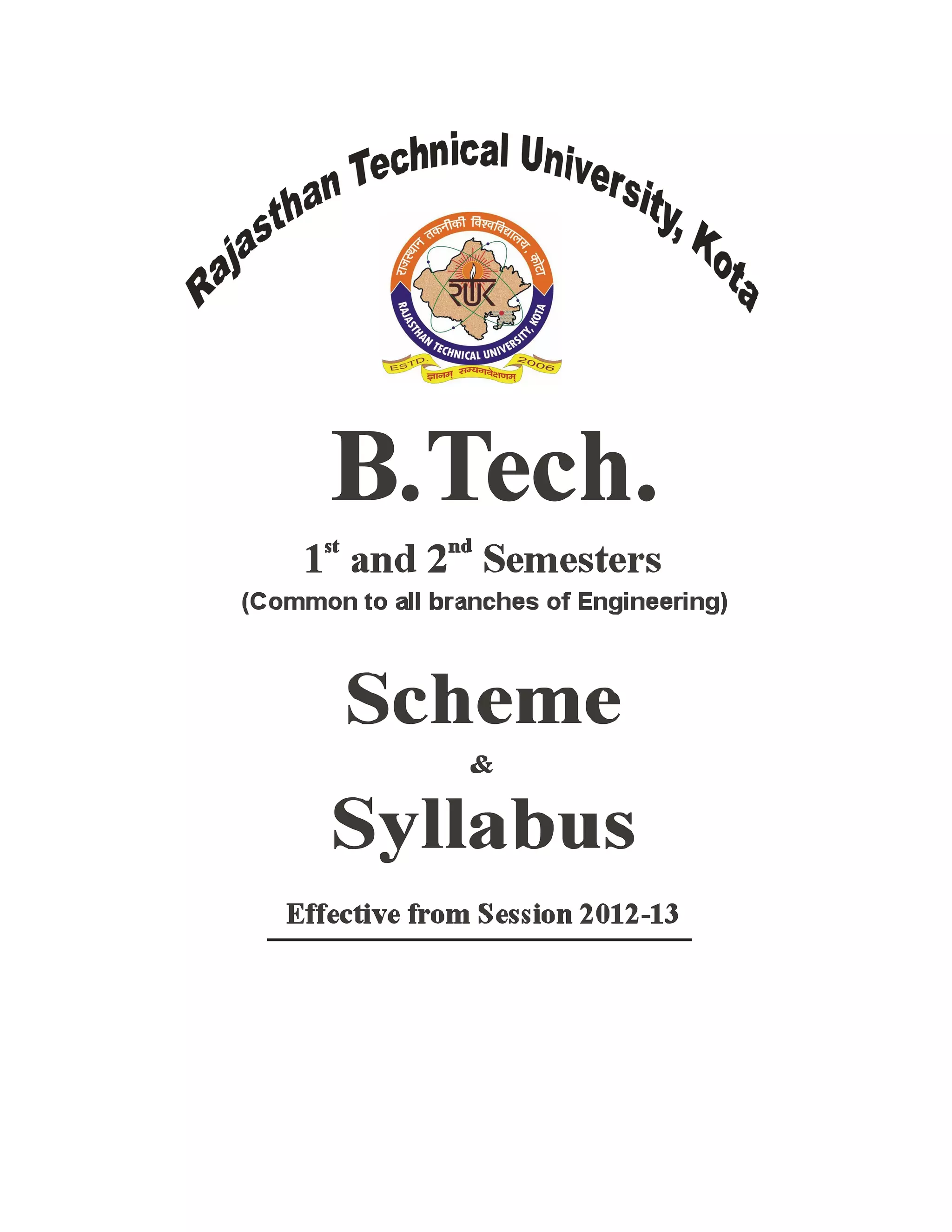 This document provides the scheme and syllabus for the first and second semesters of the B.Tech program at R.T.U., Kota effective from the 2012-2013 session. It includes: