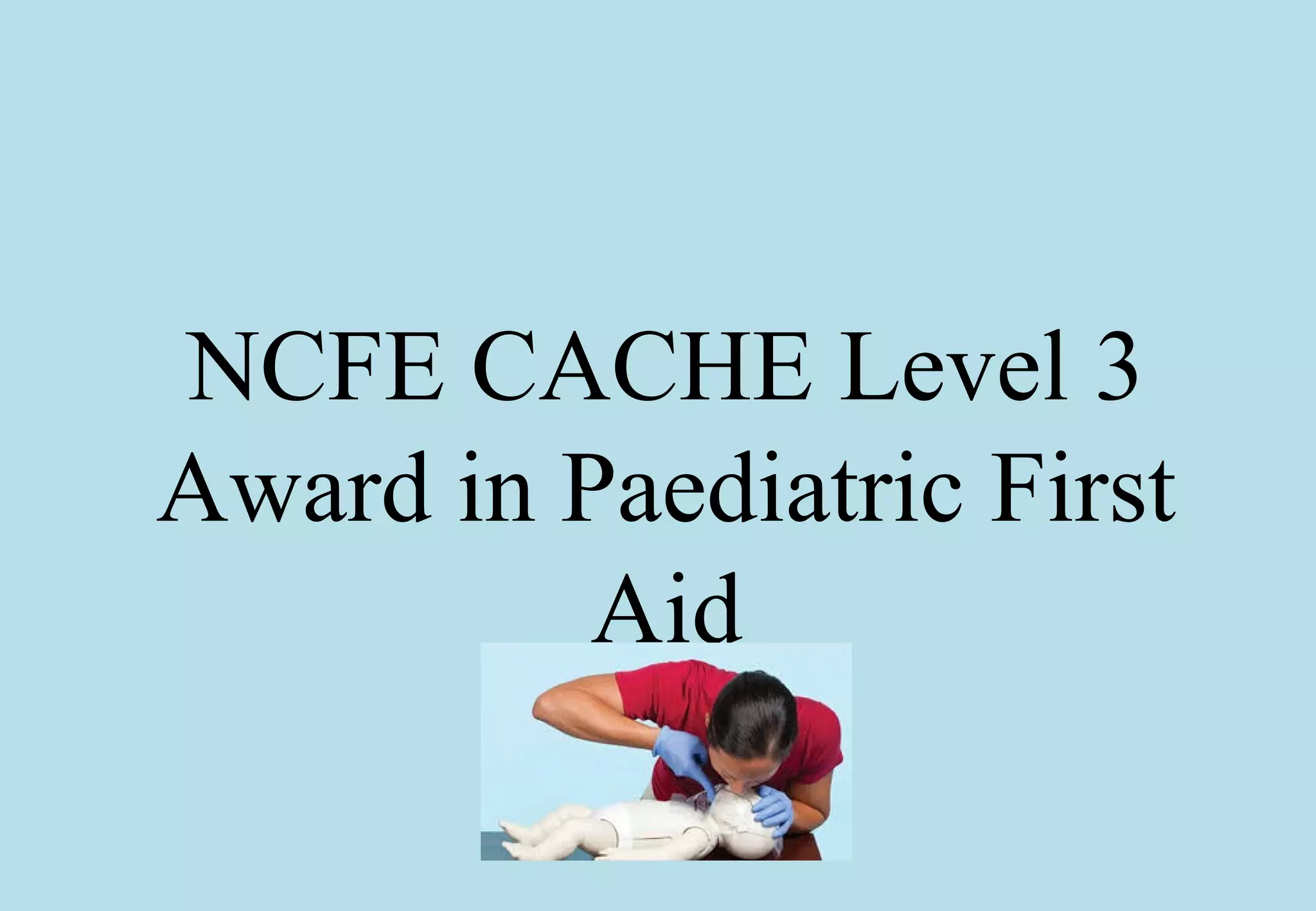 This document provides information on paediatric first aid training, including learning outcomes, definitions, responsibilities, and emergency procedures. It defines an infant as aged 0-12 months and a child as aged 1-puberty. The primary survey process for assessing casualties is DRABC, checking for danger, response, airway, breathing, and circulation. First aiders should conduct a scene survey, provide CPR if needed, and call for emergency help, providing location, number of casualties, and extent of injuries when doing so. Personal protective equipment like gloves should be worn to prevent infection.