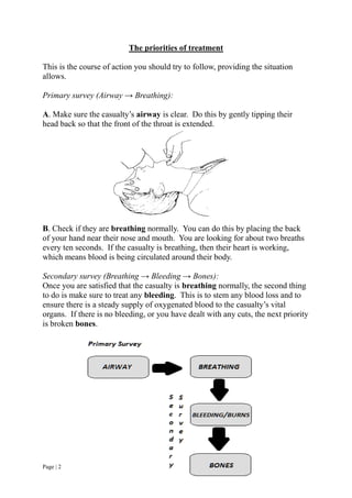 2. It describes the priorities of first aid treatment - checking the airway and breathing in a primary survey, and then checking for bleeding or broken bones in a secondary survey.
