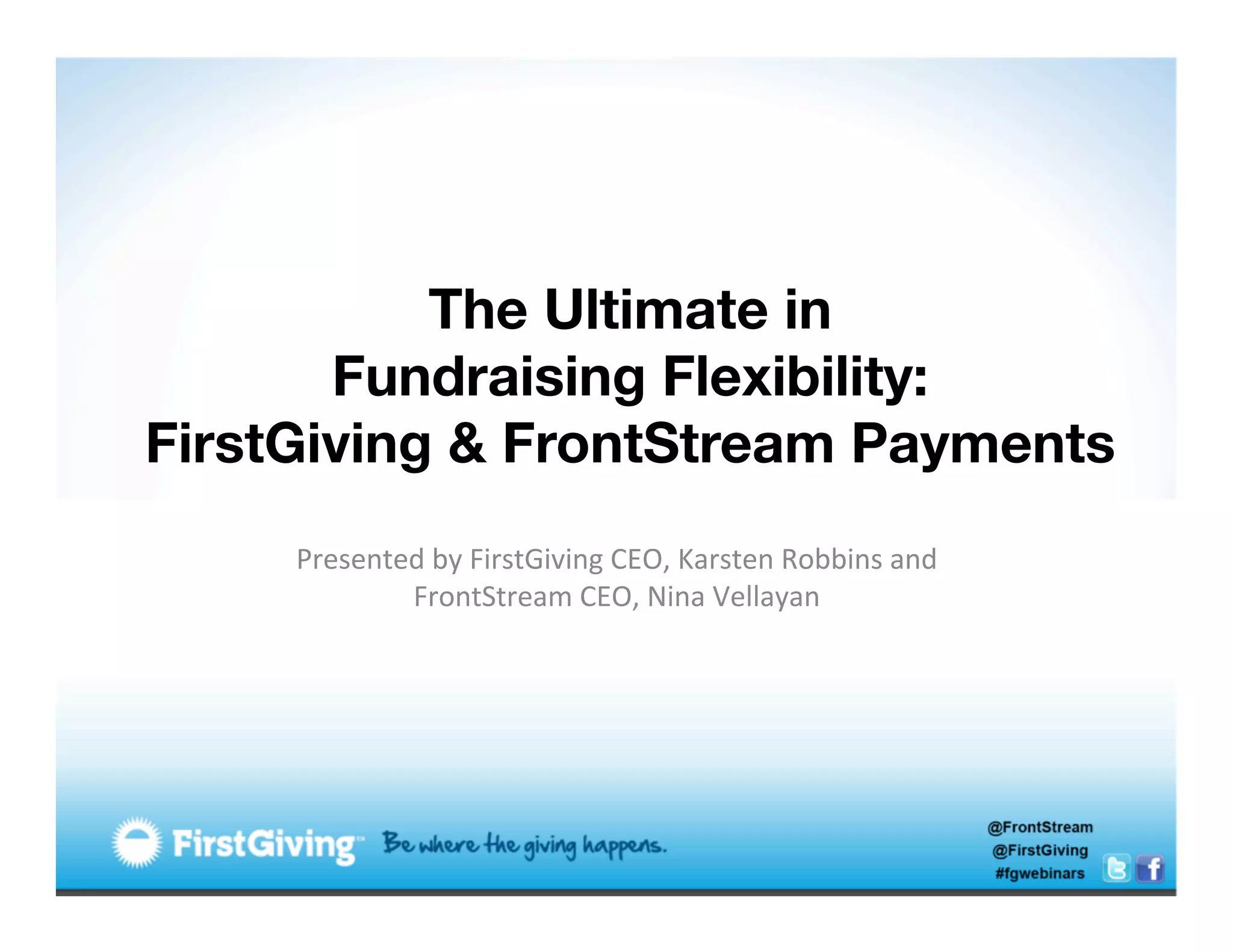 The document summarizes a webinar presented by FirstGiving CEO Karsten Robbins and FrontStream CEO Nina Vellayan about FirstGiving being acquired by FrontStream Payments. The webinar discusses how the acquisition will benefit both companies and nonprofits by consolidating the nonprofit donation processing market, providing a robust yet affordable fundraising toolset, and exposing their payment processing expertise through APIs. Key products and upcoming features are also outlined, including improved reporting, mobile giving options, and integrations with other third party tools.