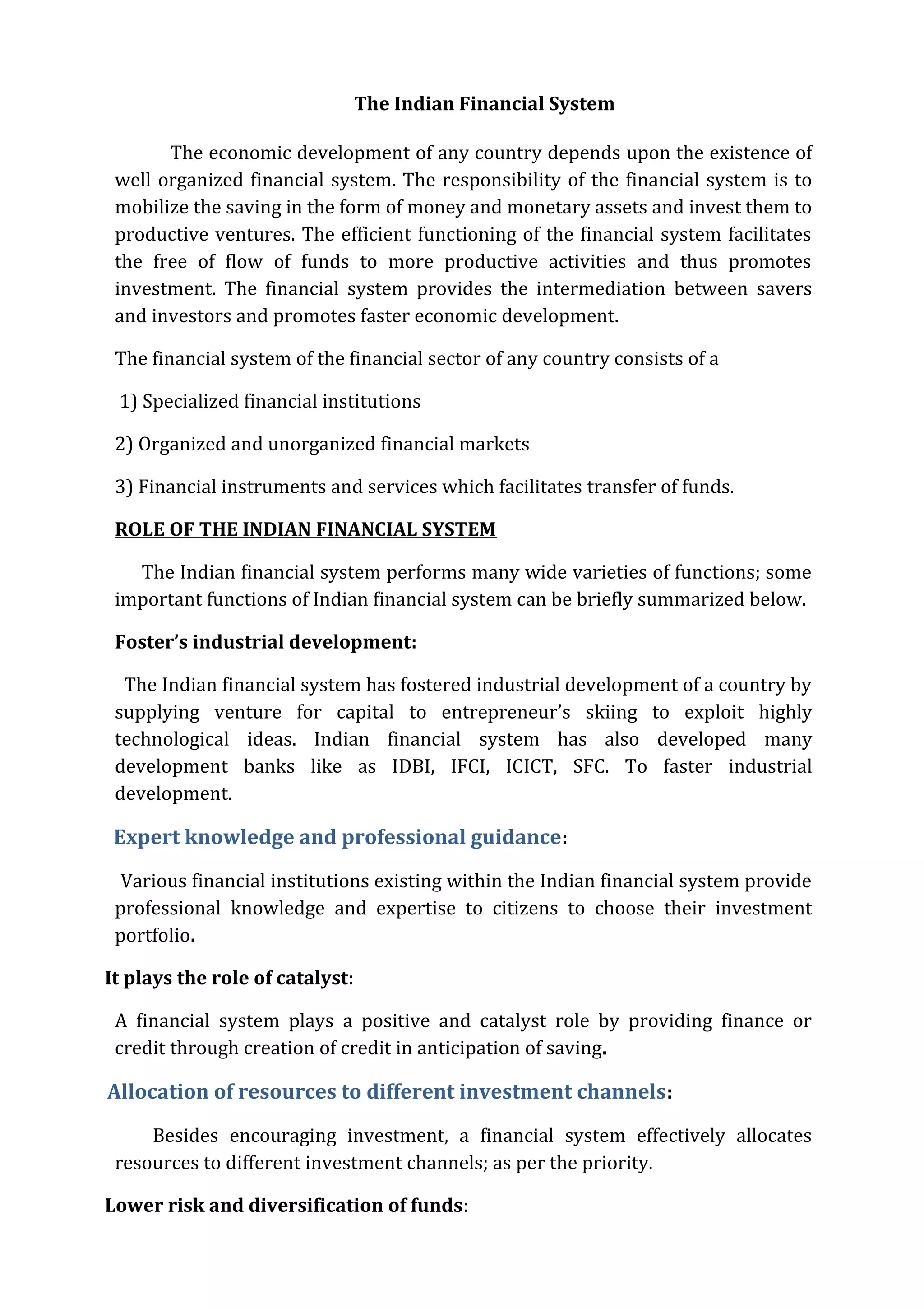 The document discusses the Indian financial system. It describes the key components of the system, including specialized financial institutions, organized and unorganized financial markets, and financial instruments and services. It then provides details on the role and functions of the Indian financial system in fostering industrial development, providing expertise, acting as a catalyst for investment, allocating resources, and more. The document also outlines several innovations and developments in the Indian financial system from the 1990s onward, such as new stock markets, credit rating agencies, depository institutions, and the growth of mutual funds, private banks, and foreign investment.