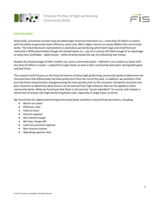 This research brief examines the financial profiles of high-performing community banks, revealing that despite the challenges faced during the Great Recession, some banks with less than $1 billion in assets managed to outperform their larger counterparts. Key differentiators of success included effective loan portfolio management, efficient expense control, and strong credit quality. The findings highlight the importance of adaptability and diverse strategies in maintaining profitability amidst economic fluctuations.
