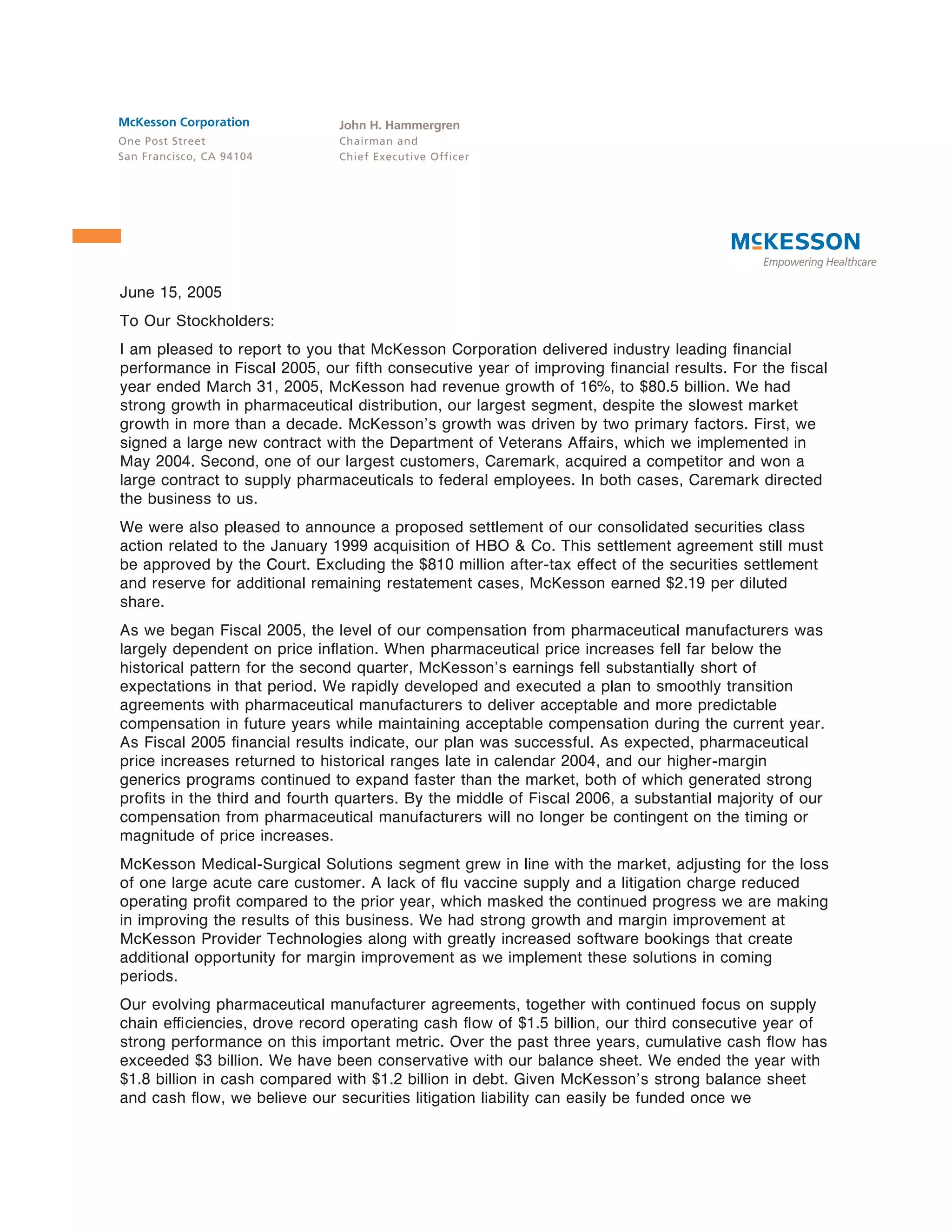 - McKesson Corporation reported strong financial performance for fiscal year 2005, with revenue growth of 16% to $80.5 billion, driven by new contracts with the VA and Caremark. Excluding litigation settlements, earnings were $2.19 per share. - The company transitioned agreements with pharmaceutical manufacturers to deliver more predictable compensation and address issues when price increases fell below expectations. Record operating cash flow of $1.5 billion strengthened the balance sheet. - Business segments saw growth in pharmaceutical distribution and alternate site medical supplies, while profits in medical-surgical solutions were reduced by litigation and lack of flu vaccine. Software bookings reached record levels and implementations accelerated.