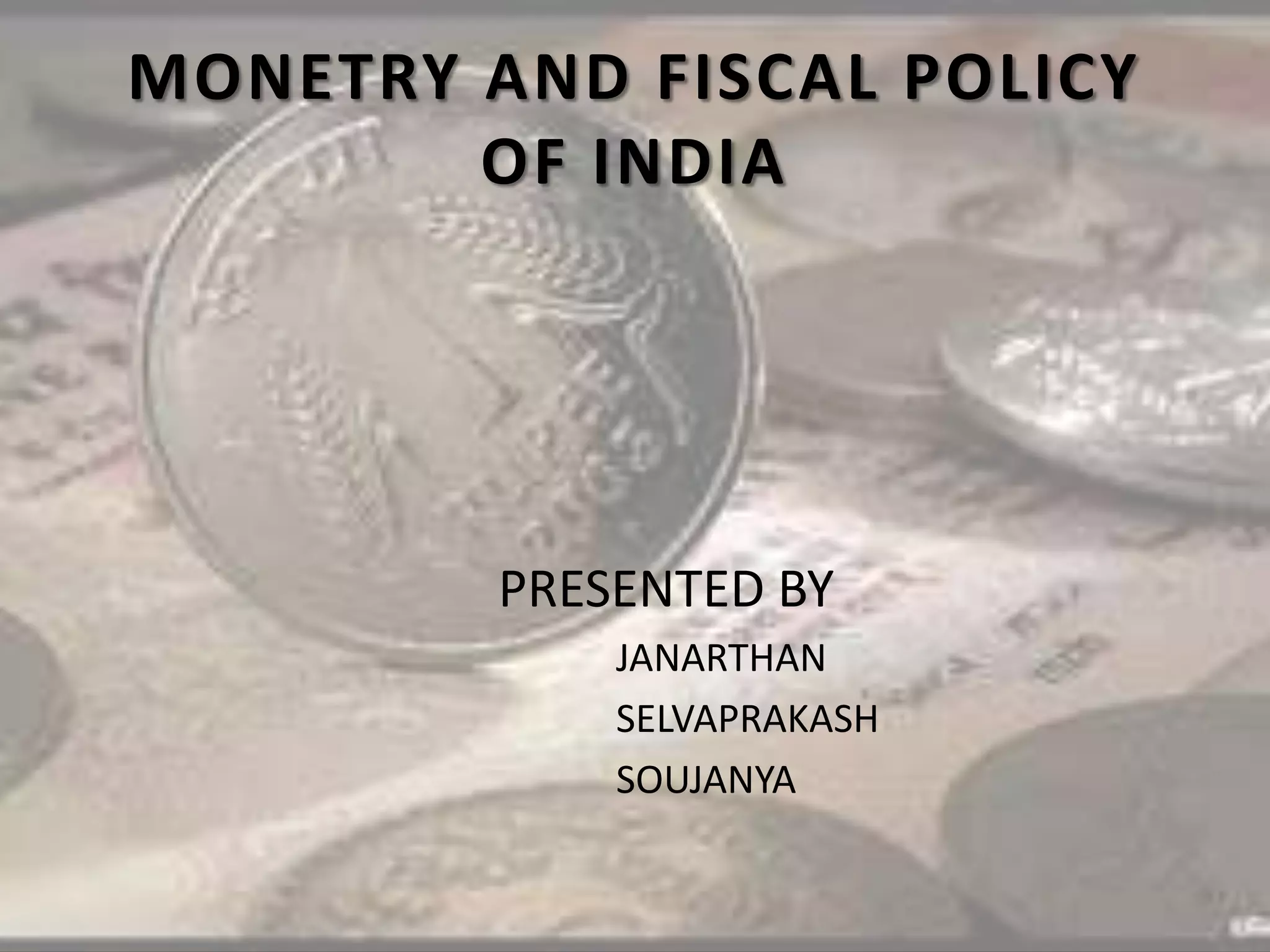This document discusses monetary and fiscal policy in India. It defines monetary policy as how the central bank controls money supply through interest rates to maintain price stability and economic growth. It describes various monetary policy tools used by the Reserve Bank of India including bank rate, open market operations, statutory liquidity ratio, cash reserve ratio, repo rate, and reverse repo rate. The document also defines fiscal policy as government policy regarding taxation and expenditures. It outlines objectives of fiscal policy such as development, employment, income distribution, and economic activity. Instruments of fiscal policy include taxation, expenditure, and methods of funding deficits.