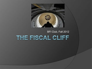 The document discusses the potential economic effects of going over the "fiscal cliff" at the end of 2012, which would result in large tax increases and spending cuts. [1] Going over the cliff could plunge the economy into a recession in 2013, reducing GDP growth by 0.5% and increasing unemployment to 9.1%. [2] While it would significantly reduce the budget deficit, the spending cuts and tax increases would also cut consumer spending, cause businesses to fail, and reduce mass employment. [3]