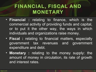 This document discusses fiscal planning and budgeting. It defines key terms like financial, fiscal, and monetary. It explains the objectives and importance of fiscal planning, which includes determining capital requirements and structure, framing financial policies, and adequately utilizing resources. The steps in fiscal planning and factors affecting it are outlined. Budgeting is also defined and the steps in the budgetary process are provided, including budget preparation, review, and monitoring.