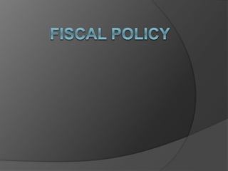 Fiscal policy refers to a government's spending and tax policies. It aims to stabilize economic growth and avoid booms and busts. Fiscal policy tools include government spending, taxation, and borrowing. Governments use these tools to influence aggregate demand and influence goals like economic growth, inflation, and unemployment. Fiscal policy plays a crucial role in mobilizing resources, boosting employment and development, and stabilizing an economy.