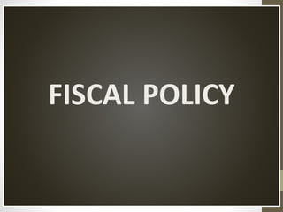 Fiscal policy deals with a government's taxation and spending decisions. It has several components, including tax policy, expenditure policy, investment strategies, and debt management. The two main instruments of fiscal policy are the revenue budget, which consists of tax and other receipts, and the expenditure budget, which estimates revenues and expenses over time. Fiscal policy aims to influence macroeconomic indicators like employment, inflation, and economic growth through adjustments to tax rates and public spending. It can take an expansionary, contractionary, or neutral position depending on whether spending is higher, lower, or equal to revenues collected.