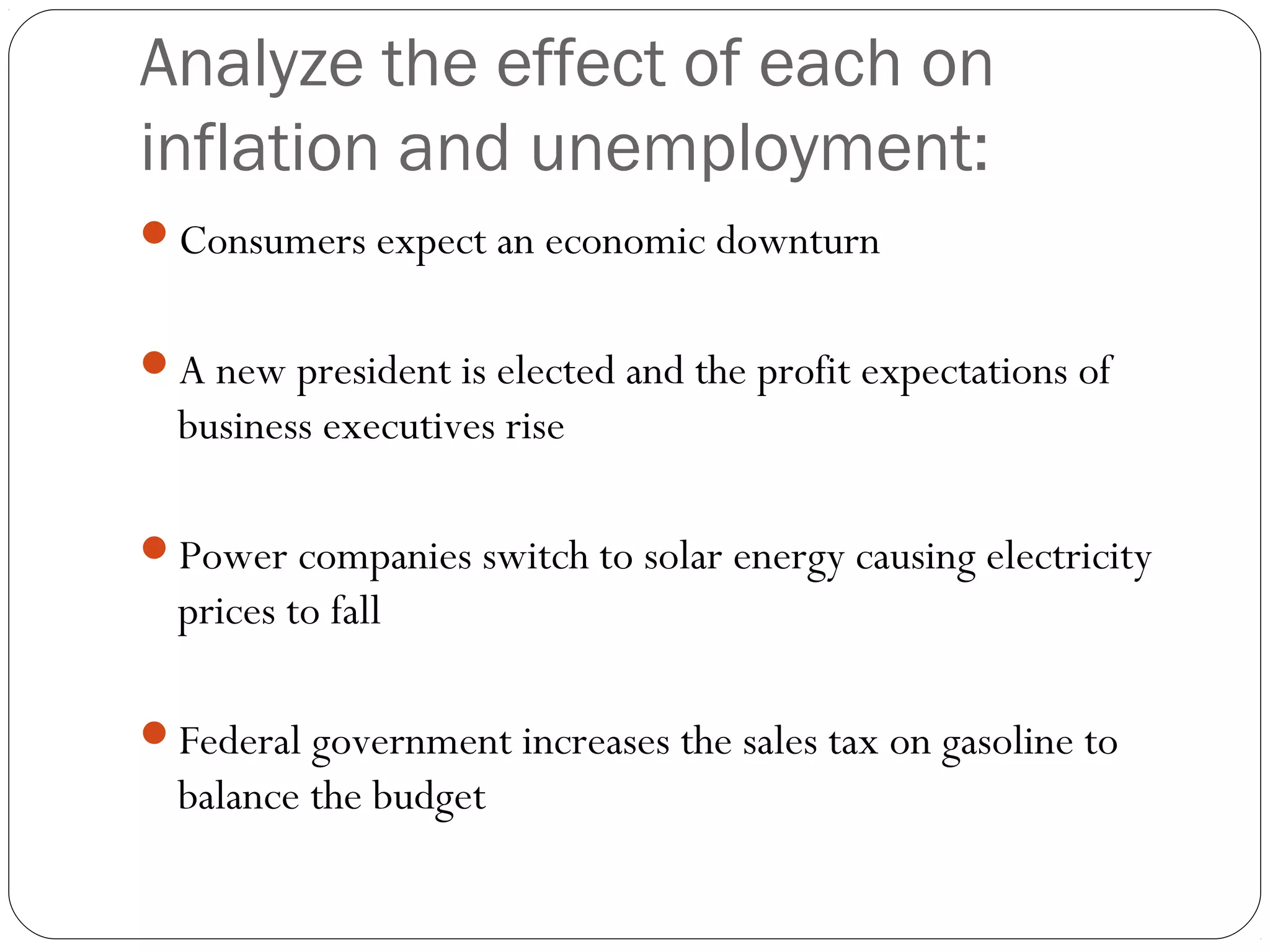 The document discusses the effects of various economic events and policies on inflation and unemployment: