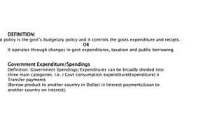 The document provides an overview of fiscal policy, including definitions, government expenditures and revenues, objectives, instruments, and importance. It emphasizes the roles of public expenditure, taxation, and the impact of fiscal policy on economic growth and stability, particularly in developing countries. Additionally, it discusses concepts like crowding out/crowding in effects, discretionary fiscal policy, contractionary fiscal policy, government budget constraints, economic theories, and decentralization.