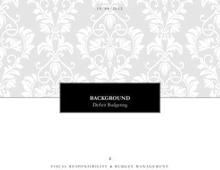 The document discusses the fiscal responsibility and budget management in India, influenced by keynesian economics and subsequent policies on deficit budgeting. The Fiscal Responsibility and Budget Management (FRBM) Act of 2003 established guidelines for responsible governance, aiming to maintain fiscal discipline and reduce deficits. It also outlines various fiscal indicators and strategies for management, while addressing the challenges faced by India in meeting these fiscal targets, especially post the global financial crisis.