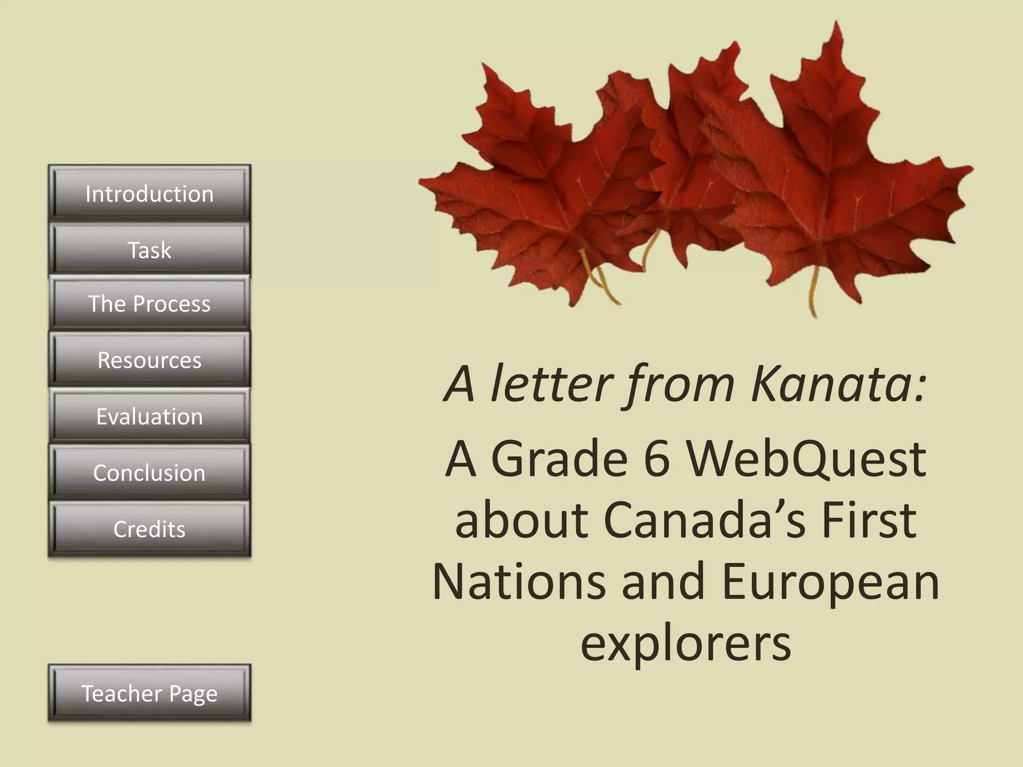 This document outlines a WebQuest activity where students take on the roles of either European explorers or Indigenous peoples in early 1600s Canada. Working in teams, students will research aspects of the two cultures and write a letter home describing their experiences and observations of the other group over the past two years of contact. The WebQuest provides guidance on research topics, resources for learning about each culture, expectations for a collaborative project product, and a rubric for evaluation. The goal is for students to develop understanding about the period of initial contact between Europeans and Indigenous peoples in Canada.