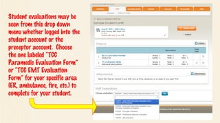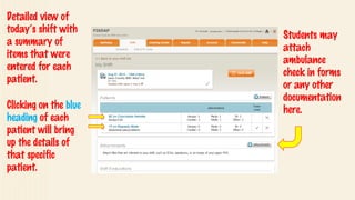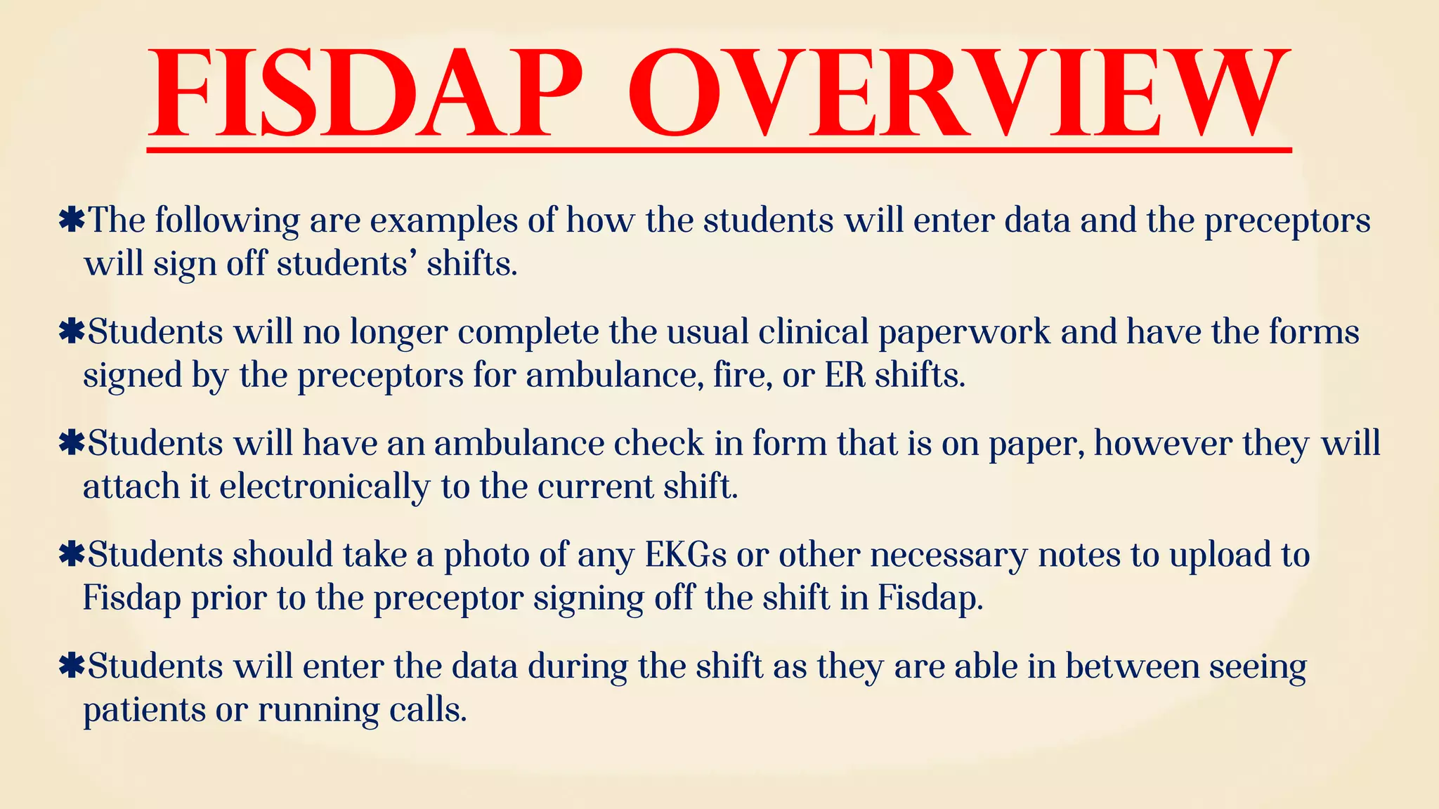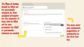 Fisdap is a platform that helps connect EMS students with preceptors for field clinical experience. It lists the names of several EMTs and paramedics who are available as preceptors, along with their level of certification and month/year that certification was obtained. The summary also directs students to additional educational videos online.