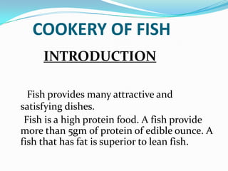 This document discusses cuts of fish and cooking methods. It defines common cuts of fish such as fillets, paupiettes, supremes, goujons, meuniere, tron, darne, mignon, pile, and medallions. Fillets are deboned long flat pieces of fish without skin. A paupiette is a fillet that has been stuffed and rolled. Several cuts like goujons are thin strips cut from fillets. Meuniere involves pan-frying fish and finishing it with butter, parsley and lemon juice. The document provides illustrations and descriptions of different fish cuts.