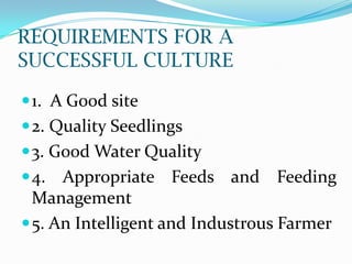 This document discusses the requirements for a successful fish culture, including having a good site with adequate water supply, quality seedlings, appropriate water quality, feeds, and an intelligent farmer. A good site needs a stable water source, soil that retains water, and topography allowing gravity draining. Water supply is most important as fish need water to breathe, eat, grow, and reproduce. Feeds must meet the nutrients needs of the cultured fish species. The farmer must work hard to prepare the pond, manage feeding and water quality, sample the pond, and ultimately harvest the fish.