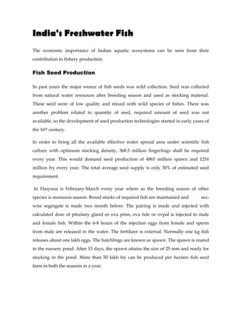 This document summarizes information about fish farming in India, including different species of fish that are farmed. It discusses indigenous fish species like various carps, as well as exotic species imported from other countries. For each type of fish, it provides details on physical characteristics, habitat, breeding, and use in aquaculture. The document categorizes fish into groups like indigenous carps, exotic carps, air-breathing fishes, and ornamental fishes. It provides information on commercially important species like various carps, catfish, climbing perch, and tilapia.