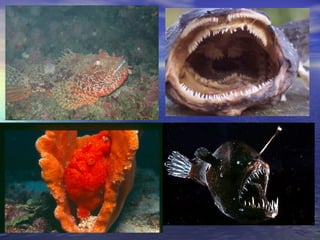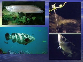 The document discusses different fish feeding techniques including filter feeders, scavengers, ambush feeders, gulp and suck feeders, and surface feeders. It also briefly covers common fish diseases like ich, hole in the head disease, and fungal infections.